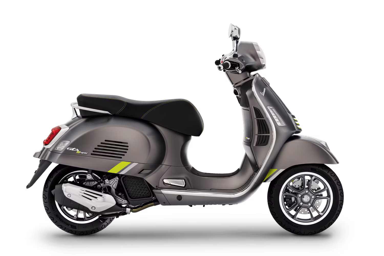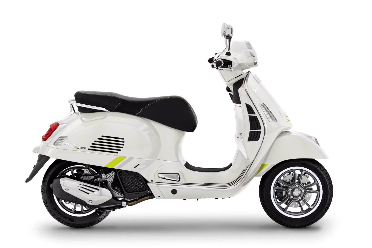 Een onderscheidende en winnende uitstraling, kenmerkend voor de GTS, gecombineerd met exclusieve charme en pure techniek. De Vespa Gts SuperTech kenmerkt zich door opvallende kleuren, met glanzende en matte uitvoeringen die het hightech en verfijnde design benadrukken. De chromen lijnen en fluorescerende details versterken de futuristische ziel. Het geheel wordt geaccentueerd door het zwarte zadel met contrasterende stiksels, wat het geheel nog eleganter maakt.